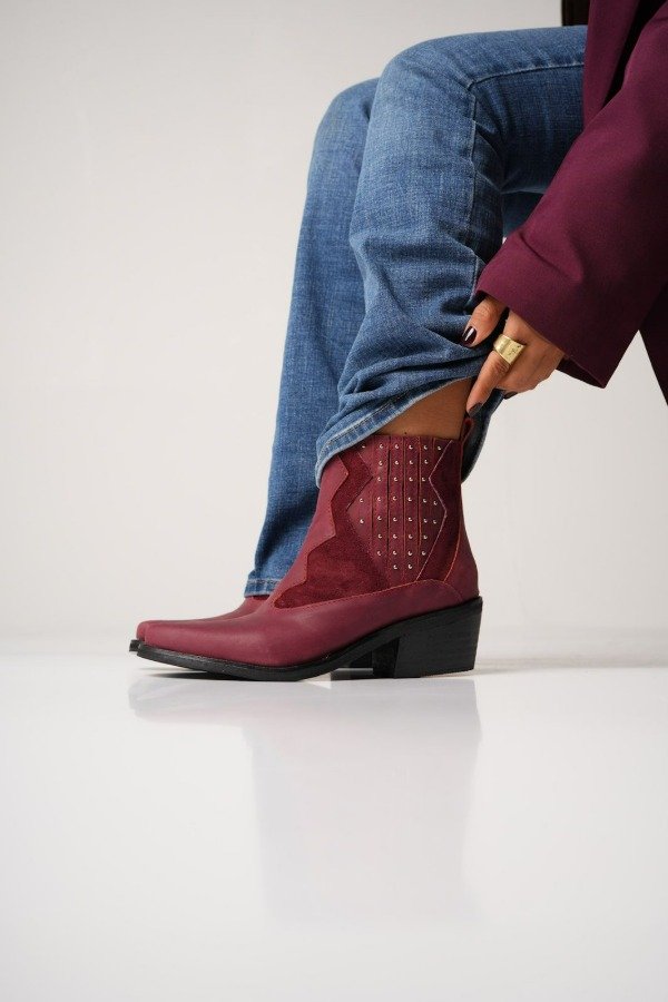 Bota texana, en cueto y gamuza con detalles en elastico y tachas. Del 35 al 40. 4 colores. Negro, Marron, Bordo y Suela.